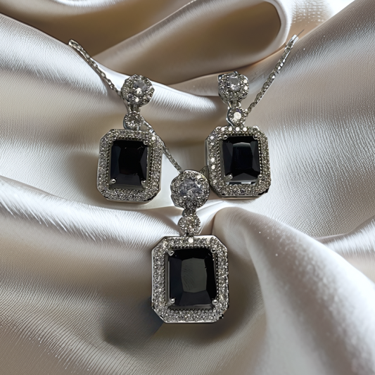 Luxury Black Crystal Jewelry Set – Silver Necklace & Earrings for Women