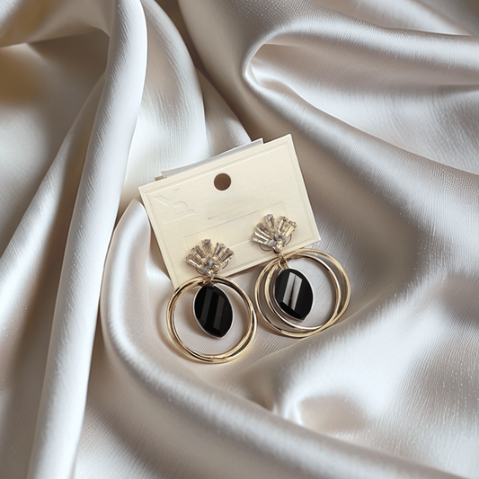 Elegant Crystal Fan & Black Drop Statement Earrings
