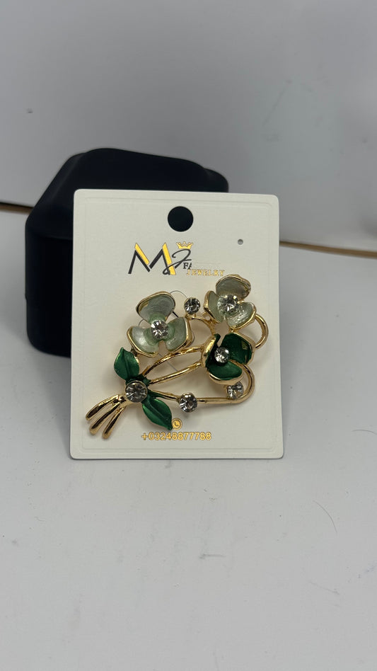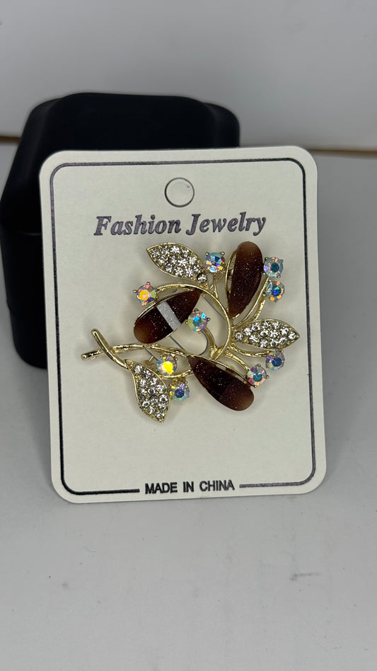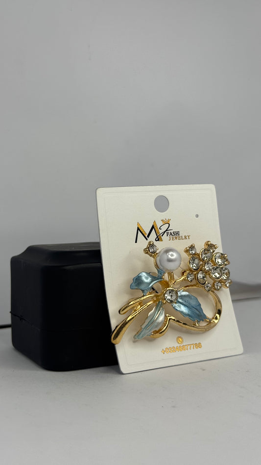 Elegant Pearl & Crystal Floral Brooch Pin – Gold Leaf Design