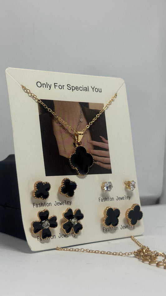 Black Clover Pendant Necklace & 6-Pair Earring Gift Set – Stylish Combo for Women