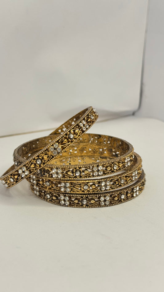 Traditional Antique Gold Plated Bangles with White Stones – Set of 4