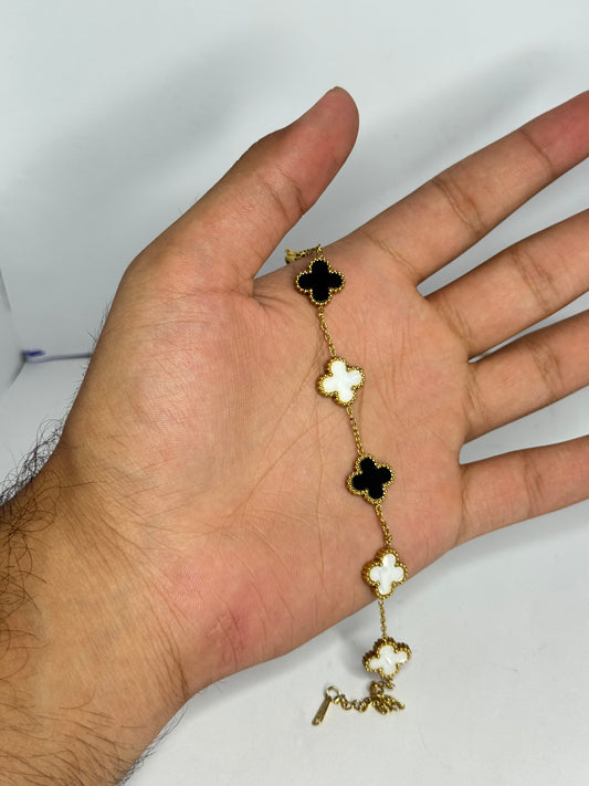 Elegant Black & White Clover Charm Bracelet – Gold Plated