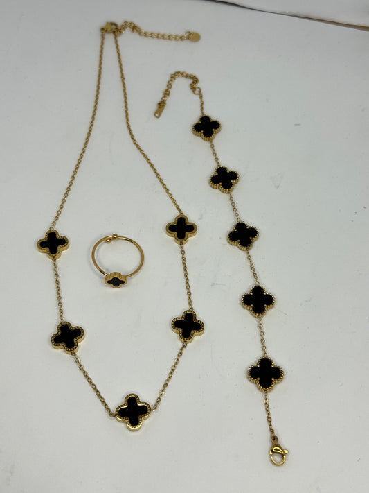 Luxury Black Clover Jewelry Set – Necklace, Bracelet & Ring (3-Piece Gold Plated Set)